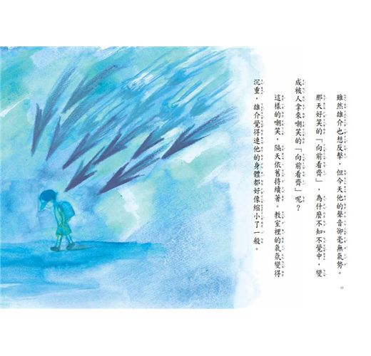 停下腳步、補充能量,才能勇敢的迎向成長。雄介在班上是第二矮,班上個頭最小的是康之,按照身高排隊時,雄介站在康之後面,把雙手向前平舉看齊。但是康之轉學了,朝會時換雄介站在最前面,結果他一聽到「向前看齊」時,居然把手舉了起來,引起了一陣爆笑。