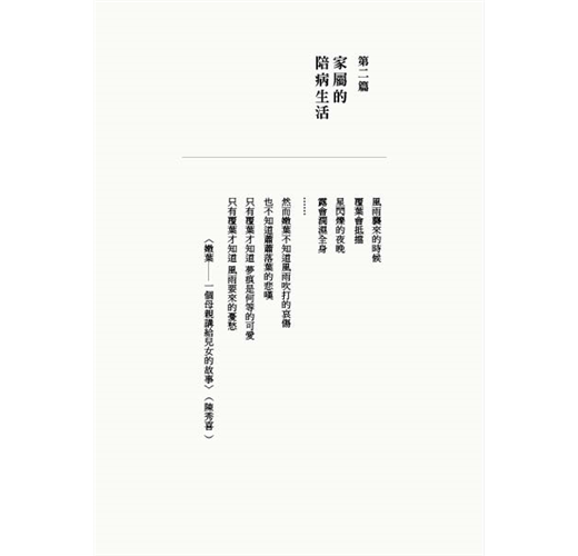 作者以細膩的觀察與同理,呈現這些不會被外人看見的經驗,透過這本文集,可以看到在現場中,跳脫疾病標籤與專業框架,直視他者生命的重量,並從看似邊緣的位置中,反思現階段醫療化的侷限,並從親身的實踐中,推動微小而細緻的改變。——張子午(《報導者》記者)