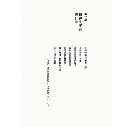 全書分為三篇:第一篇為精神失序者的日常生活;第二篇描繪的是精神失序者家屬的陪病生活;第三篇寫社關員是誰,工作性質,以及對制度的省思與批判,也寫作者和精神失序者及家屬相遇的經驗。