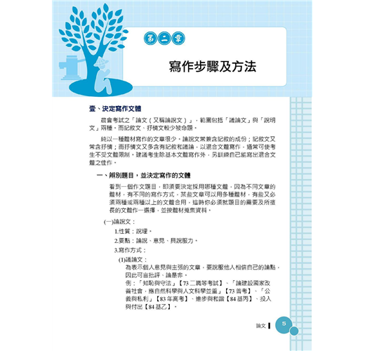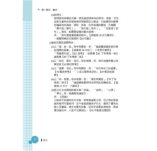 國文論文從寫作步驟仔細教起,提綱挈領介紹作文五招:「審題、構思、布局、修辭、檢查」,一氣呵成寫出好文章。歷屆試題範例供考生吸收寫作技巧與佳句,上場寫作言之有物,就能獲得閱卷老師的青睞。