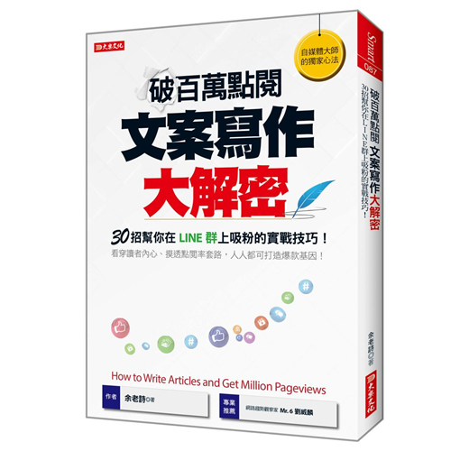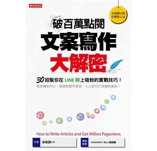 放心!本書教你用「聊天模式」、「習武三階段」、「底層規律」等30招獨家方法,解密LINE群、臉書等社群網站上破百萬點閱的文案,為什麼可以吸引粉絲瘋狂按讚分享!