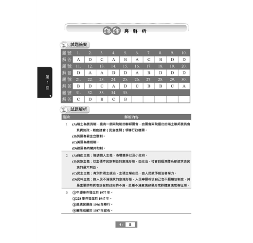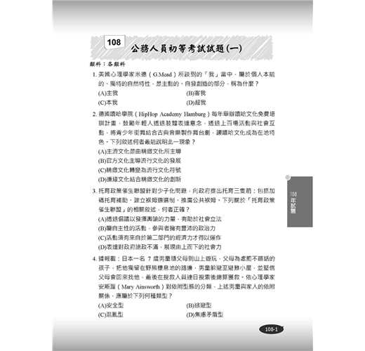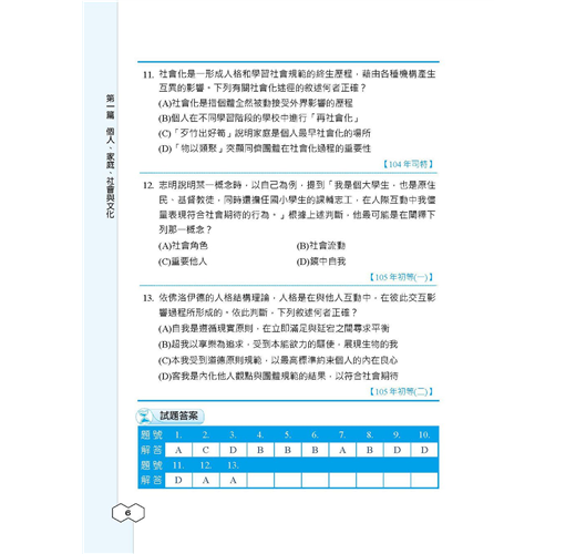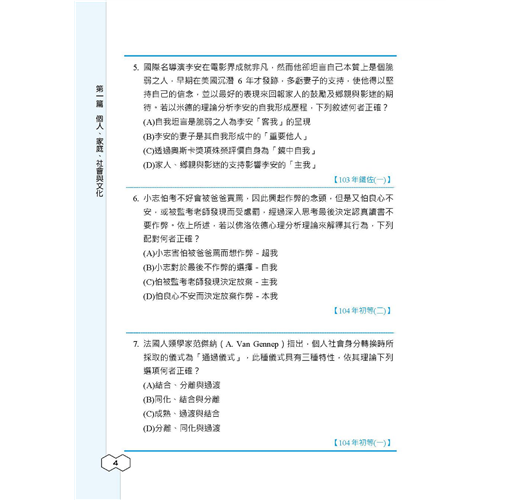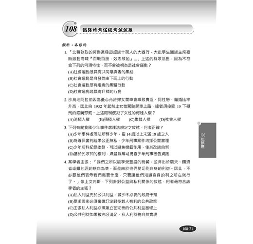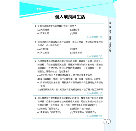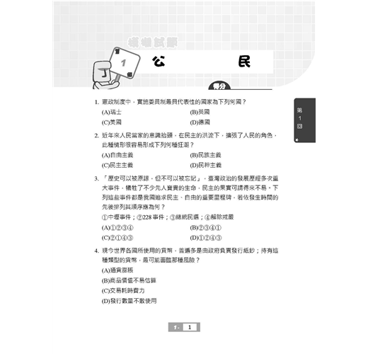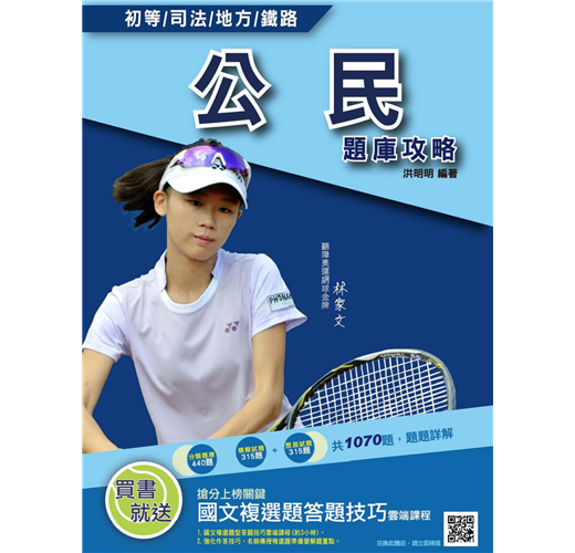 ★奪分,就靠大量演練試題!★【主題式分類題庫】440題+【模擬試題】315題+【歷屆試題】315題=1070題精華奪分題★歷屆試題全面到位,題庫就是你的彈藥庫,一本在手,制霸無敵!☆三階段地毯式複習,步入考場無懸念!《公民題庫攻略》採用三階段題庫,幫你做地毯式複習,找出必救之處!第一階段【主題式分類題庫】:依初等考試公民考科重點內容分為「個人、家庭、社會與文化」、「國家、政府與政治」、「民主與法治」、「生產、分配與消費」四大篇440題,每題皆有詳細解析,有助讀者統整考題性質與出題脈絡,增加考生重點與考題的整合能力。第二階段【模擬試題】:附有五回試題315題,是讀者熟悉題型與出題方向的機會,增加考生有效掌握考試重點的機率。第三階段【歷屆試題】:收錄近年公務人員初考、鐵路佐級、地方特考五等考題,讓考生鑑往知來,掌握公民考情趨勢!共315題,題題皆有詳細解析,考生在研讀重點內容後,勤做試題演練,必能掌握考科的關鍵重點。☆百分之百題題名師詳解,宛如親授!充分練習題目再核對答案與解析,就能獲得充分的學習效果!《公民題庫攻略》採用「名師式詳解」,每道題目都撰寫詳細透徹的解析,有如名師在旁指導解惑,任何難題輕鬆舉一反三。題目與解析獨自編排,省去邊寫題目邊遮答案的困擾。題庫就是你的彈藥庫,妥善利用「題庫書」工具,金榜題名一點都不難!☆九點新修法及時更新,別傻傻練到舊法題目本書試題符合最新修法要點,包括民法(108.06.19)、刑法(108.06.19)、少年事件處理法(108.06.19)、公民投票法(108.06.21)、勞動基準法(108.06.19)、行政訴訟法(107.11.28)、刑事訴訟法(108.07.17)、民事訴訟法(107.11.28)、公職人員選舉罷免法(108.01.09)。考生千萬別傻傻拼命練習舊法題目,透過本書,就不用擔心練錯題!☆準備公民,請跟老師這樣做公民是許多社會學科的大雜燴,舉凡心理、社會、經濟、政治、法律、文化、道德等七大內容都涵蓋在內,由於包山包海不易準備,許多考生常因不知如何下手準備,不是如無頭蒼蠅亂買書,最後被考用書本淹沒,就是索性放棄,憑運氣上考場,都是很可惜的事。準備公民考科,考古題是必要掌握的一環,且應練習足夠數量的考題,以了解出題趨勢的變化。不管是初等考試、地特五等、鐵路佐級還是司法五等特考,近年來命題形態趨近於高中程度,題幹敘述也又多又長,重要答題關鍵字藏在中間,考驗考生的耐心及細心。但仔細觀察可以發現,現在的考題多以觀念的理解以及時事的整合為主要題型。所以,建議考生寫題目的時候,如果發現自己總是答錯某些範圍的題目,就要找題目多練習,且每次答題都要把觀念弄清楚,千萬不要只是背答案,這樣是很難拿高分。最重要的是,選擇依單元分類的考古題參考書,才可以快速掌握同章節內的考試重點,學習才會有效率。【封面人物】林家文拍出不一樣的人生實力是無聲的榮譽※獲獎2018年總統教育獎獲獎人2017年第23屆聽障奧運網球女子雙打、女子單打雙金牌2015年世界聽障網球賽女子雙打金牌2014年世界聽障網球錦標賽團體組冠軍2013年聽障奧林匹克網球代表隊選拔賽女子單打亞軍2013年全國運動會女子團體組銅牌