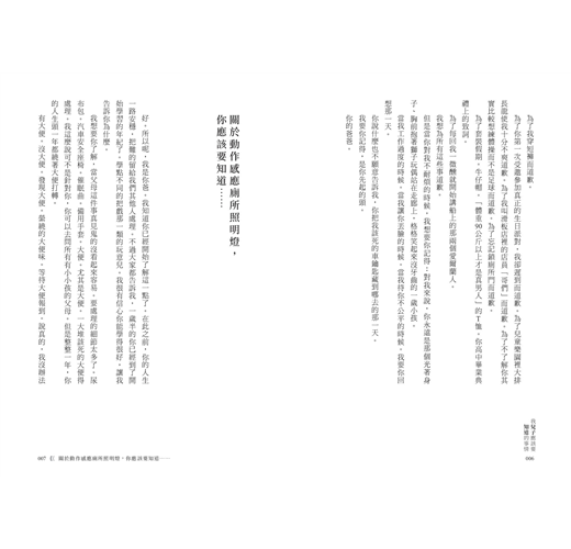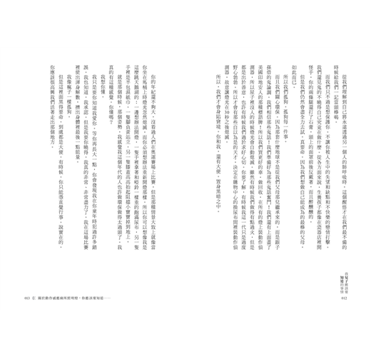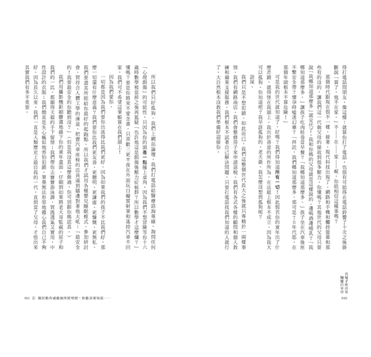 我們用攝影機鉅細靡遺地錄下你的童年畫面,仔細到如果將老大哥監視的屋子和我們的一比,都顯得天殺的手下留情;我們帶你去寶寶游泳課,買既透氣又實用,中性設計的衣服;我們簡直是失心瘋似地害怕犯錯。筆墨無法形容地擔心我們自己不夠好。因為長久以來,我們一直是人類歷史上最自我的一代,直到當了父母,才悟出來其實我們有多不重要。