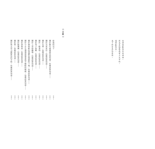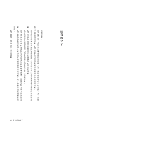 為了接下來十八年左右我會做的事道歉。為了我將會錯過的一切道歉。為了我將無法了解的事情道歉。為了所有你不想讓我知道的親師座談會評語道歉。