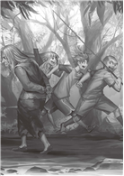 突然,郭耀諾聽見叭噗叭噗的聲音,旋即一輛黑色俗稱鐵馬的骨董老爺腳踏車,出現在那群矮胖國中生的旁邊。只見那牽著黑色鐵馬的人,身形瘦小,身著土色麻布長袖上衣和灰色麻布長褲,頭則包著黑色頭巾。那人佇立在夕陽時分的昏暗陰影下,看上去,整個人彷彿像是瀰漫在黑暗中的一團陰影。呼,呼,突然間有陰森森的冷風吹過。只見那瘦小的人,一個俐落的動作就把很重的鐵馬嘰嘎立了起來。頃刻間,原本喧鬧的巷子裡,眾人全都噤聲不語。時空似乎跟著停滯了,那群國中生全都一動也不動,直到那黑影下的人,慢慢把原本低著的頭給抬了起來。