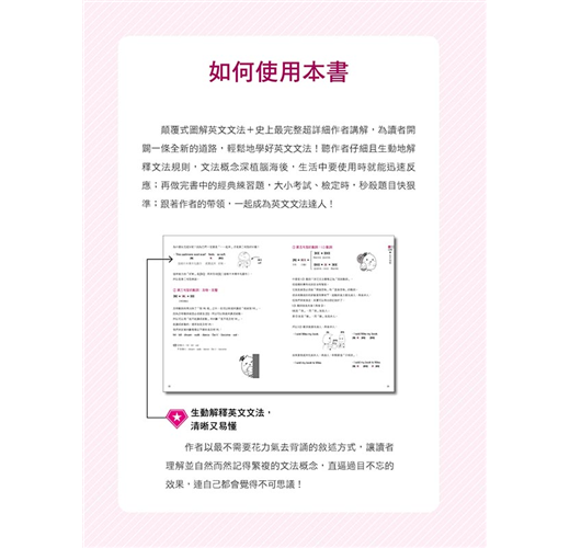 顛覆式圖解英文文法+史上最完整超精細作者講解,為讀者開闢一條全新的道路,輕鬆地學好英文文法!聽作者仔細且生動地解釋文法規則,文法概念深植腦海後,生活中要使用時就能迅速反應;再做完書中的經典練習題,大小考試、檢定時,秒殺題目快狠準;跟著作者的帶領,一起成為英文文法達人!