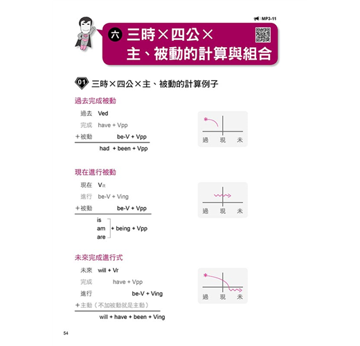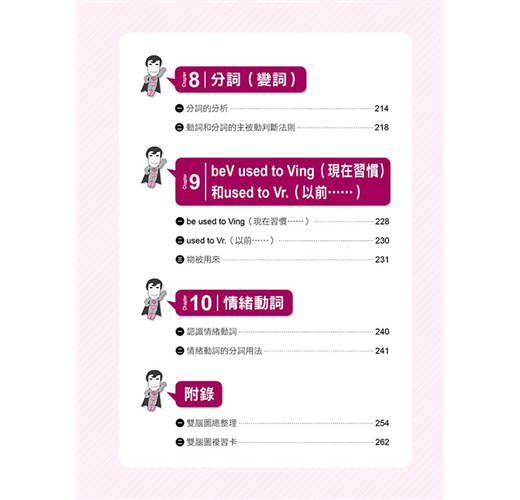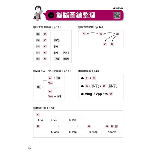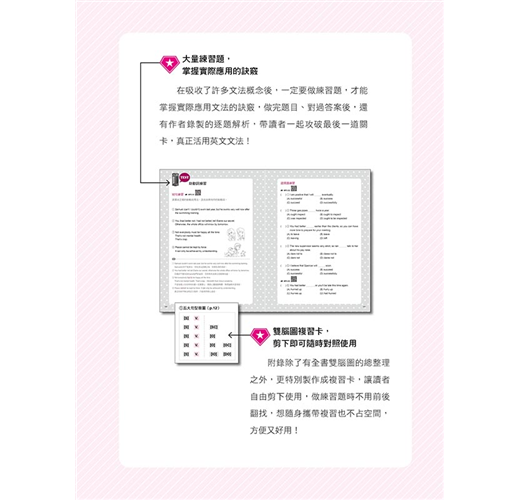 而本書每個章節中,都生動解釋英文文法、搭配豐富的雙腦圖幫助記憶,再複雜的文法規則都能一一擊破!更有作者親錄全書詳解、加上特聘外籍名師錄製標準英文發音,讓你只要買一本書,就能把老師和課程一起帶回家!而每個章節附有大量的練習題,還可以將書末的雙腦圖複習卡剪下,一邊協助解題,學習英文文法滴水不漏!說明如下: