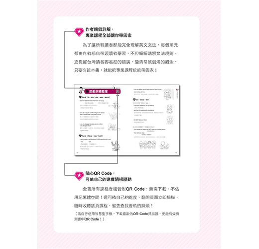 為了讓所有讀者都能完全理解英文文法,每個章節都由作者親自帶領讀者,在第一章,作者也特別為初學者放慢解說的步調,陪著初學者一起慢慢撥開腦中的文法迷霧、逐漸掌握英文文法的輪廓,全書不但細細講解文法規則,更提醒台灣讀者容易犯的錯誤、釐清常被混淆的觀念,只要有這本書、隨掃隨聽QR Code,專業課程統統帶回家!