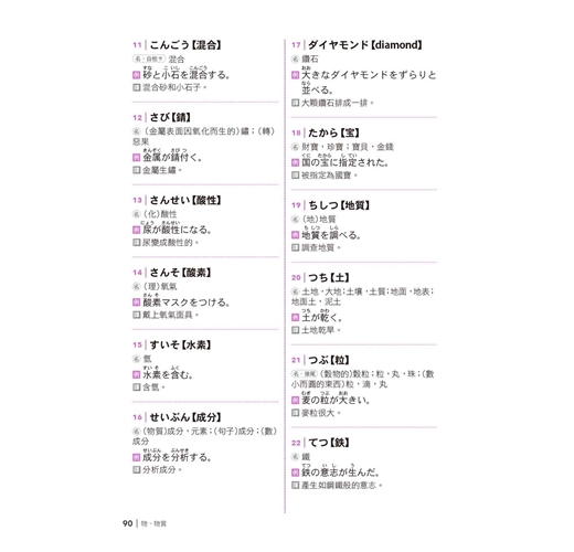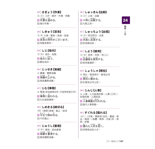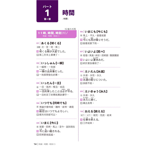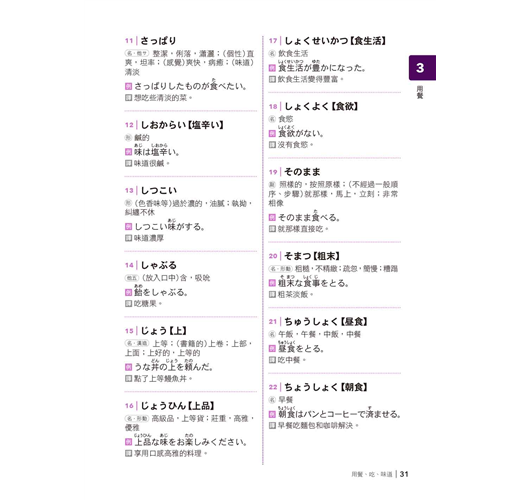 3. 速攻王─掌握單字最準確:依照情境主題將單字分類串連,從「單字→單字成句→情境串連」式學習,幫助您快速將單字一串記下來,頭腦清晰再也不混淆。每一類別並以五十音順排列,方便您輕鬆找到您要的單字!中譯解釋的部份,去除冷門字義,並依照常用的解釋依序編寫而成。讓您在最短時間內,迅速掌握日語單字。