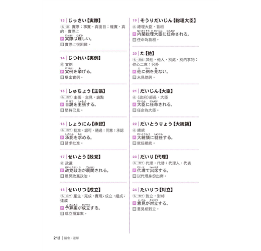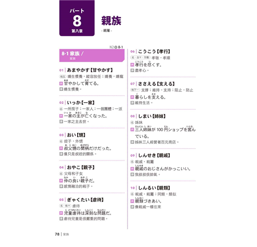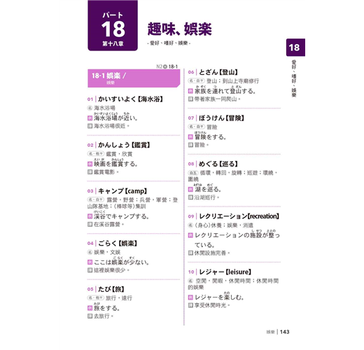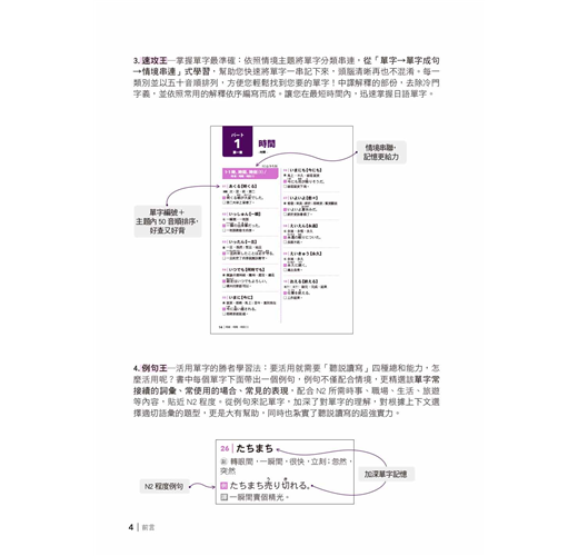 4. 例句王─活用單字的勝者學習法:要活用就需要「聽說讀寫」四種總和能力,怎麼活用呢?書中每個單字下面帶出一個例句,例句不僅配合情境,更精選該單字常接續的詞彙、常使用的場合、常見的表現,配合N2所需時事、職場、生活、旅遊等內容,貼近N2程度。從例句來記單字,加深了對單字的理解,對根據上下文選擇適切語彙的題型,更是大有幫助,同時也紮實了聽說讀寫的超強實力。