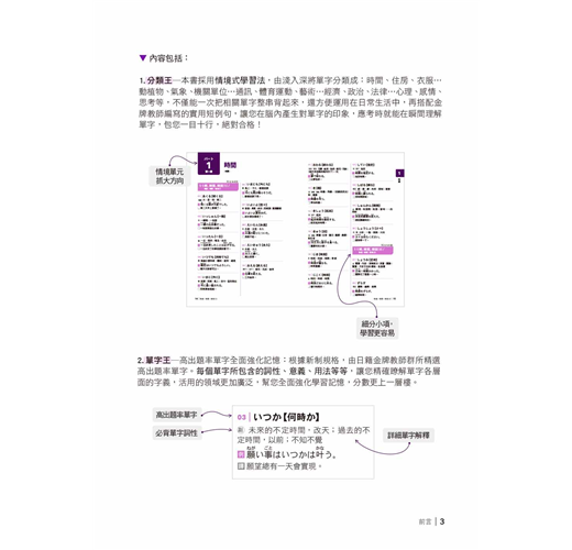 2. 單字王─高出題率單字全面強化記憶:根據新制規格,由日籍金牌教師群所精選高出題率單字。每個單字所包含的詞性、意義、用法等等,讓您精確瞭解單字各層面的字義,活用的領域更加廣泛,幫您全面強化學習記憶,分數更上一層樓。