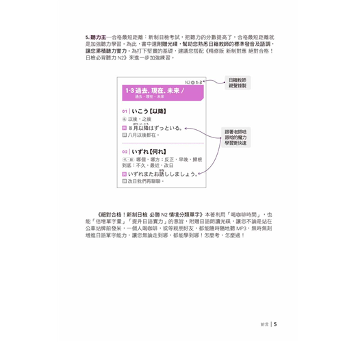 5. 聽力王─合格最短距離:新制日檢考試,把聽力的分數提高了,合格最短距離就是加強聽力學習。為此,書中還附贈光碟,幫助您熟悉日籍教師的標準發音及語調,讓您累積聽力實力。為打下堅實的基礎,建議您搭配《精修版 新制對應 絕對合格!日檢必背聽力N2》來進一步加強練習。