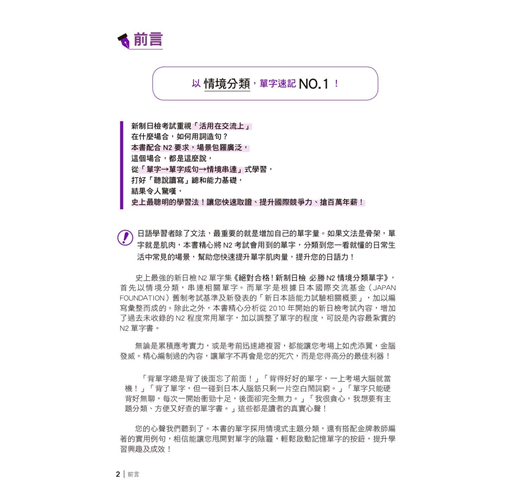 史上最強的新日檢N2單字集《絕對合格!新制日檢 必勝N2情境分類單字》,首先以情境分類,串連相關單字。而單字是根據日本國際交流基金(JAPAN FOUNDATION)舊制考試基準及新發表的「新日本語能力試驗相關概要」,加以編寫彙整而成的。除此之外,本書精心分析從2010年開始的新日檢考試內容,增加了過去未收錄的N2程度常用單字,加以調整了單字的程度,可說是內容最紮實的N2單字書。