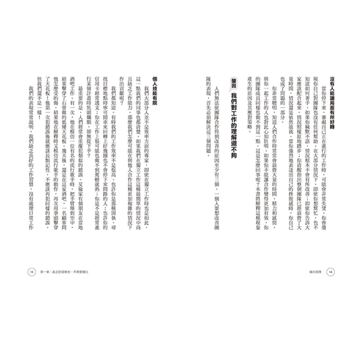 你可能想要糾正別人的做法,但是也不管用。你可能見過有的人想要努力改善大家一起工作的方式,但收效甚微,而且他還因此受到別人的排擠,吃力不討好。如果有人好心提出建議,有時反而會受到冷落:「不要浪費我們的時間,我們要工作。」更甚者還會被反唇相譏:「你以為你是誰?老闆嗎?」在這種情況下,你很想聳聳肩膀說:「既然這樣,那我能做什麼呢?」