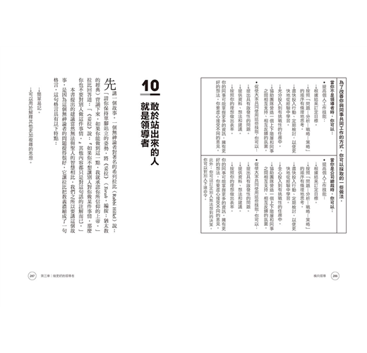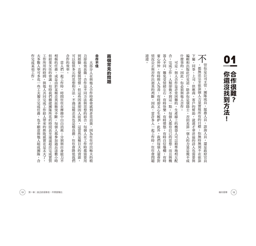 本書的目標就是讓你有能力與你的同事展現有效率的合作,取得高品質的結果。你無須擁有高於同事的權力,只需要使用橫向領導方法就可以如魚得水。橫向領導方法包含三個基本步驟:第一步是培養和鍛鍊獨自工作的個人能力;第二步清晰理解你的戰略目標是與他人有組織地合作;第三步是學習一些「參與式」的領導方法。通過這些方法,作為團隊的一般成員,也能使用提問、作答、行動的方式促使他人更好地一起工作。