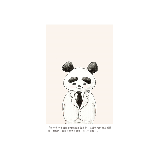 低欲望青年熊貓先生:「妳和我一樣天生都會做這兩個動作,這證明咱們的基因是相、相似的,具有情投意合的可、可、可能性。」