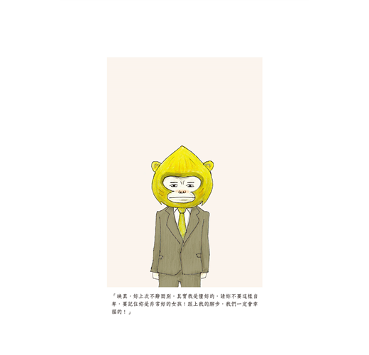 油滑雪猴:「映真,妳上次不辭而別,其實我是懂妳的,請妳不要這樣自卑,要記住妳是非常好的女孩!跟上我的腳步,我們一定會幸福的!」