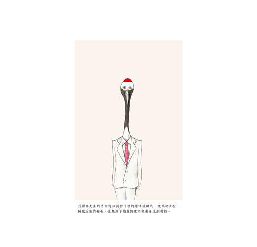 弱氣丹頂鶴:「他的手白得如同杯子裡的原味優酪乳,瘦高的身材,稀疏泛黃的卷毛,毫無皮下脂肪的皮肉包裹著這副骨骼。」