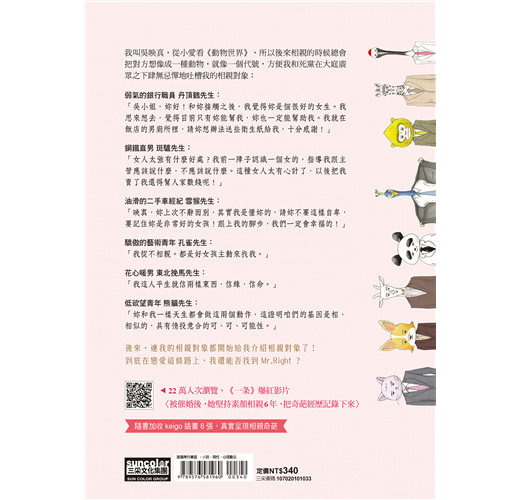 我叫吳映真,從小愛看《動物世界》,所以後來相親的時候總會把對方想像成一種動物,就像一個代號,方便我和死黨在大庭廣眾之下肆無忌憚地吐槽我的相親對象: