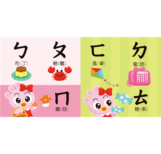 ★認識注音符號:ㄅ布丁、ㄆ螃蟹、ㄇ蘑菇、ㄈ風箏……看圖學習拼音,讓孩子跟著念一念,提早建立國語文基礎,增加學習的自信心。