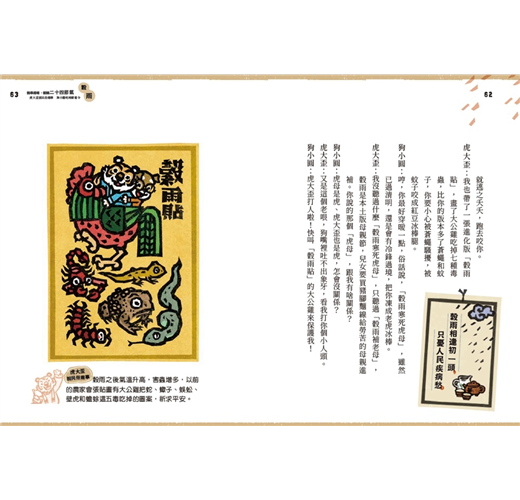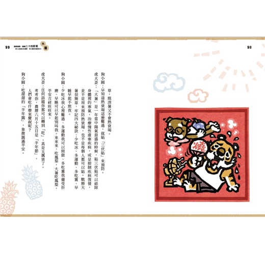 透過這本書,我們可以認識古人流傳下來的鞭春牛、咬春壓驚、拉保保、祭白虎……諸多讓人眼花撩亂的習俗,思考這些習俗背後的行為內涵,非常有趣又有意義,也印證了古人不凡的想像力呢! 家珍確實下了功夫考證諸多俗諺、詩詞、典故,藉由虎大歪和狗小圓兩人時而正經侃侃而談,時而你來我往鬥嘴,把二十四節氣與生活的緊密關係講述得活潑生動。透過虎大歪和狗小圓的表現,讀者不知不覺也學到了「說學逗唱」的基本功夫。讀完書,別忘了鼓起勇氣,上臺一鞠躬,來說一場相聲,或演一場短劇吧!