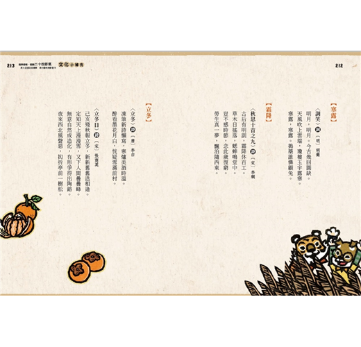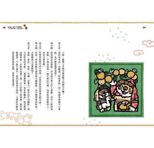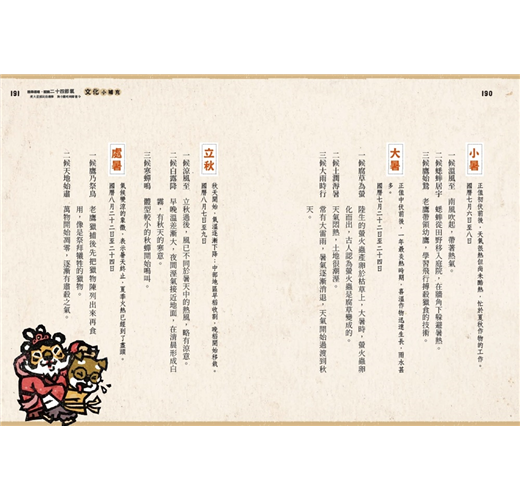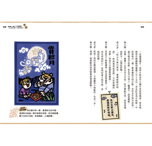 「節氣」雖是祖先留給我們的文化遺產,但絕不是文化化石,至今我們日常生活中仍處處可見節氣的影響。不過,即使清明節放假、冬至吃湯圓……人們對節氣的感受普遍不深。同屬漢字文化圈的日本,透過國定假日傳達的文化與教育意涵,就深刻許多。日本全年的國定假日中,春分日、秋分日是兩大節氣;綠之日、海之日、山之日這三個假日,讓國民禮敬並親近自然;勤勞感謝日,表徵米食民族對五穀豐收的重視與感謝;這些國定假日,讓國民從小對節氣文化有感、對大自然有禮敬之心。相形之下,該如何讓我們的孩子也能通過生活,領受「二十四節氣」這份祖先留下的文化遺產,感知自然的奧妙、體會祖先的智慧,進而順應自然,經營美好生活呢?家珍想出一個巧妙的方式,設計了兩個可愛的角色——虎大歪、狗小圓,讓他倆一搭一唱,輕鬆逗趣的把節氣的知識與文化一一說明白。