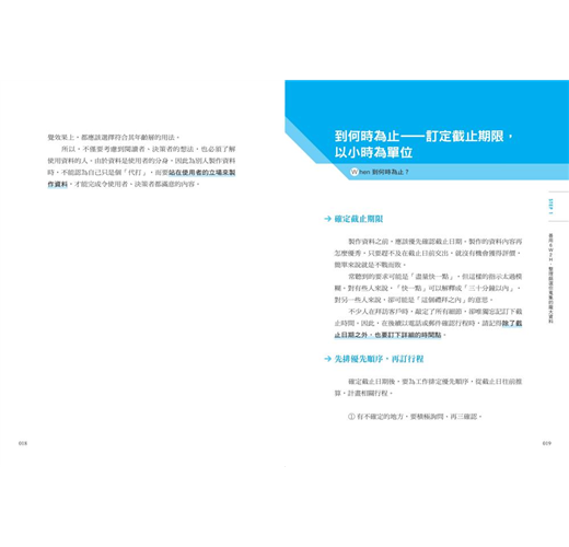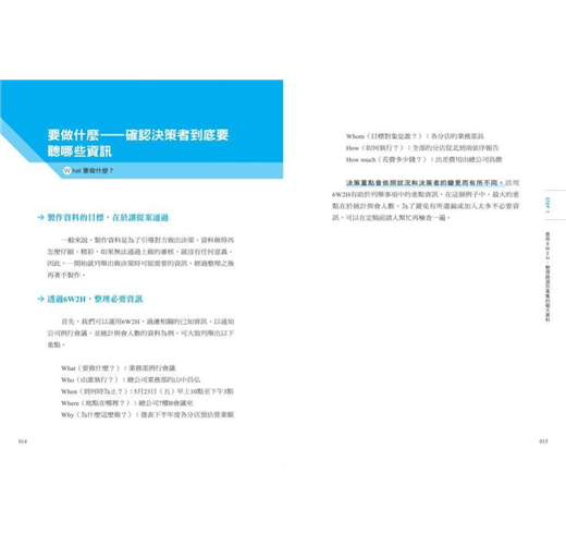 一開始不要先瞎忙找資料,得依循6W2H原則規畫格式:做什麼、對象是誰、花費多少、怎麼做等。而且在整個過程中,得不斷確認是否符合原則,才不會混亂失焦。
