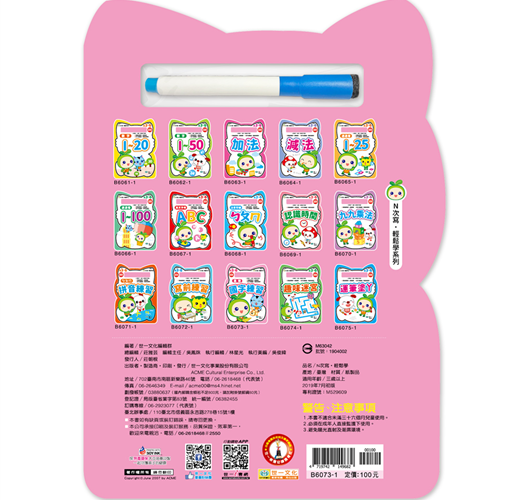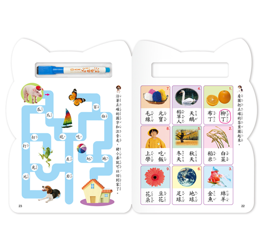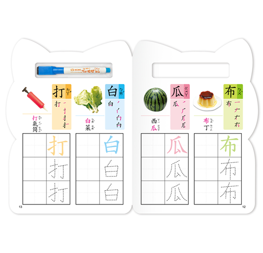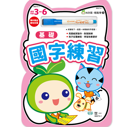 本書包含三十八個常用、簡易國字的練寫,採標準楷體國字和注音符號,每個國字均標有正確筆順及相關語詞,並附配合語詞活潑的可愛圖案,引發孩子的學習興趣;書後並附配合語詞的遊戲式綜合練習題,孩子可立即復習,加深學習印象。此外,紙張經亮面處理,並隨書附贈白板筆,方便孩子擦寫,反覆練習,是孩子奠定良好語文及書寫基礎不可或缺的好書。特別設計標準筆順及加大練寫格雙面上光,附贈白板筆,可擦寫遊戲式練習,讓學習效益更加倍