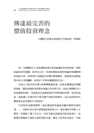 價值投資最困難之處,在於歷經了時間考驗,便宜股票於各個年代的定義上都有所不同,因此現代價值學派必須與時俱進找出符合當代適用的價值。從早期葛拉漢以最便宜的價格尋找被人遺忘的糟糕企業,到巴菲特用具安全邊際的合宜價格買進優秀企業。然而,無論這些價值先驅的理念受到多少挑戰,總有一些核心理念是價值學派永遠信奉與遵循的。《21世紀價值投資》就是嘗試將這些觀念歸納統整,並呈現這些大師實際作法最完整的一部作品。