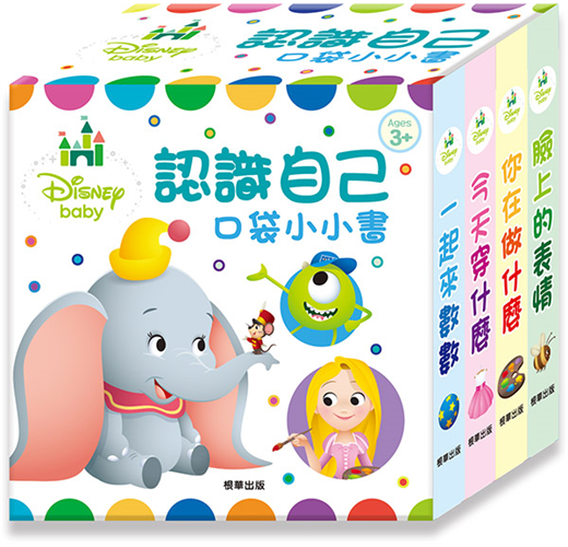 輕巧方便的口袋小小書系列,每套有4小本,每本共10頁,適合親子共讀同樂喔!★認識自己口袋小小書內容如下:1. 一起來數數:跟著Disney Baby從1數到10。2. 今天穿什麼:認識從頭到腳的穿著。3. 你在做什麼:跑跑跳跳拍拍手,和寶貝一起邊說邊做。4. 臉上的表情:臉上的表情代表怎樣的情緒呢?帶著寶貝認識自己吧!