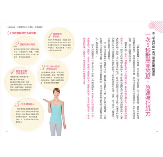 此外,本書的動作都是以我發明的「5秒健身法」為基礎所設計,每個單元的內容都是不斷重複執行「一次5秒」的動作。就算是缺乏毅力、或是不想做太累運動的讀者,也可以輕鬆實行,並維持運動的習慣。