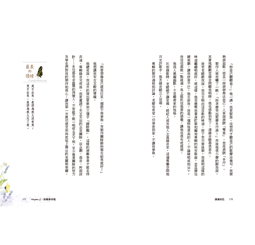 他總是說,我這次的復出要做到三個字﹁國際觀﹂,這樣的演藝事業才能走得長遠。專輯錄音完成後,我更邀請了天王天后的企宣團隊,從企劃、混音、封面設計……多位都是金曲獎的得獎人。不管能不能一唱成名天下知,至少專業團隊的努力及學生們對我的期待和用心,讓我第一次真切感受到再度站上舞台的美麗與榮耀。