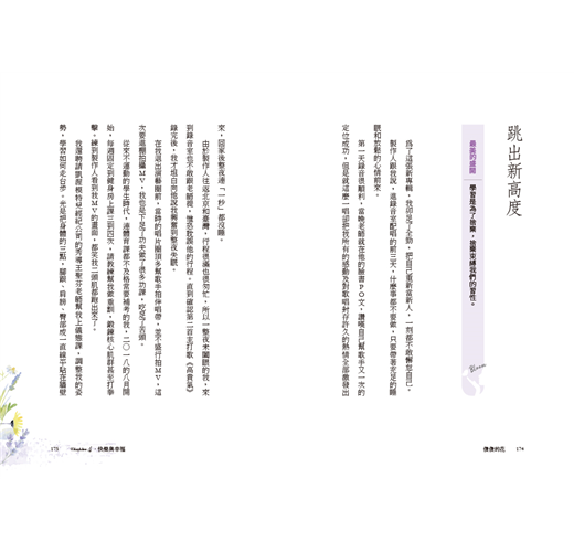 周思潔寫下自己在每一個人生階段的追夢過程和信念。從歌手到心靈導師,再重回演藝圈出唱片的心境轉折,給想要突破現狀、改變自己的人幾帖心靈藥方。