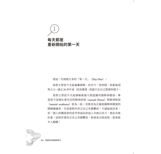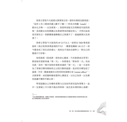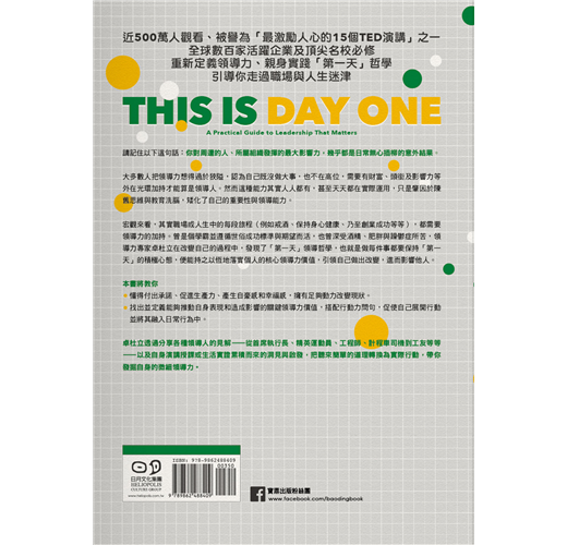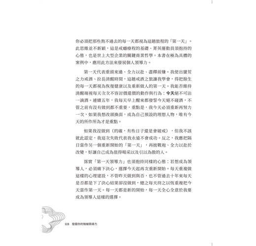 宏觀來看,其實職場或人生中的每段旅程(例如戒酒、保持身心健康、乃至創業成功等),都需要領導力的加持。曾是個學霸並遵循世俗成功標準與期望而活,也曾深受酒精、肥胖與躁鬱症所苦,領導力專家卓杜立在改變自己的過程中,發現了「第一天」領導哲學,也就是做每件事都要保持「第一天」的積極心態,便能持之以恆地落實個人的核心領導力價值,引領自己做出改變,進而影響他人。