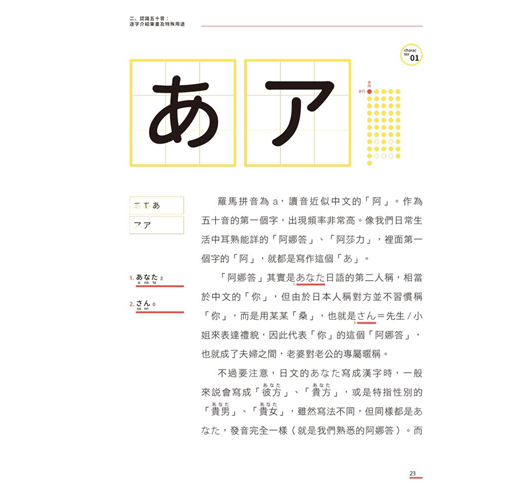 第二章是所有你需要的五十音及基礎日文知識。本書會先透過你所熟悉的中文、臺語詞彙,讓你發現,原來這些五十音在你生活中經常出現,一點也不陌生。在這裡,你也會學到和各個五十音相關的簡單(但讓你如有神助的)文法,這樣未來你要銜接進階教材時,就能更游刃有餘。以下介紹本章內容格式,讓你使用時更得心應手: