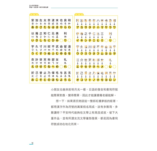 第一章告訴你日文的由來,讓你從歷史淵源了解日文字和中文字的關聯。只要看過這一章,你就懂得為什麼你「不需要害怕五十音」,而有這一層背景知識,對於你學進階、高階日文,了解日本文化深層的內容時,都有幫助。