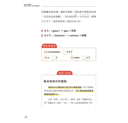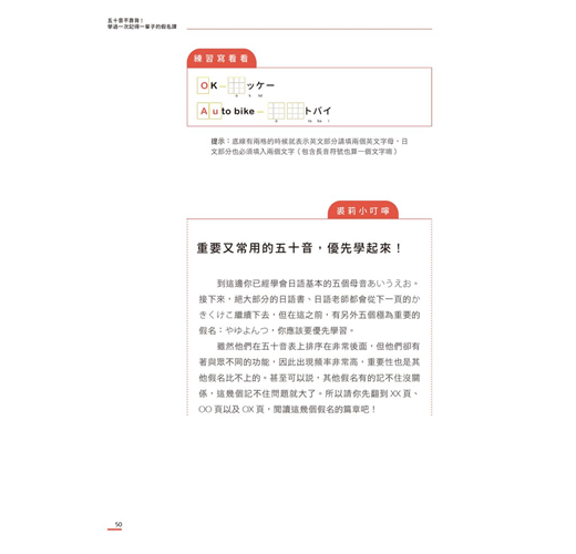 書中「順便一起學」單元,在介紹五十音的過程中帶出簡單的文法,增添學習日文的樂趣,不管您是初學者或已經學過五十音,都能帶給您意外充實的收穫。