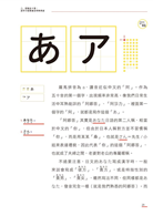 第二章是所有你需要的五十音及基礎日文知識。本書會先透過你所熟悉的中文、臺語詞彙,讓你發現,原來這些五十音在你生活中經常出現,一點也不陌生。在這裡,你也會學到和各個五十音相關的簡單(但讓你如有神助的)文法,這樣未來你要銜接進階教材時,就能更游刃有餘。以下介紹本章內容格式,讓你使用時更得心應手: