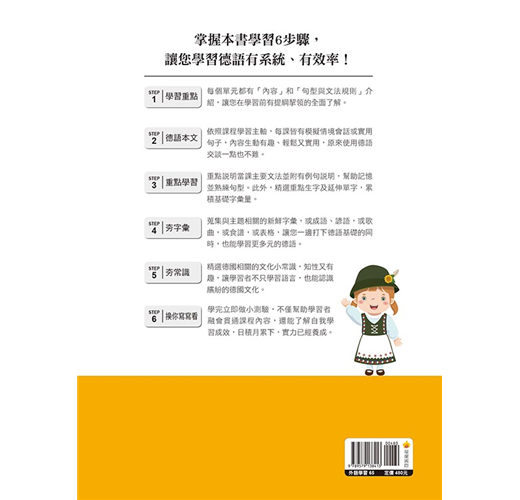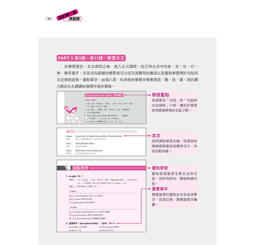 從發音、單字、句子到會話,漸進式地學習然後進入正課,正課的每一課都有「學習重點」→「本文」→「重點學習」→「夯字彙」→「夯常識」→「練習」,學習循序漸進,逐步累積德語實力!