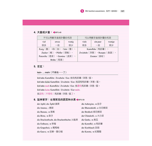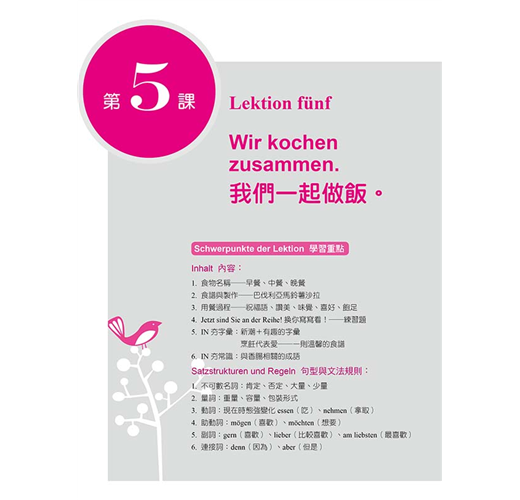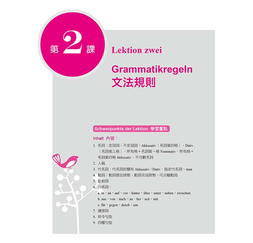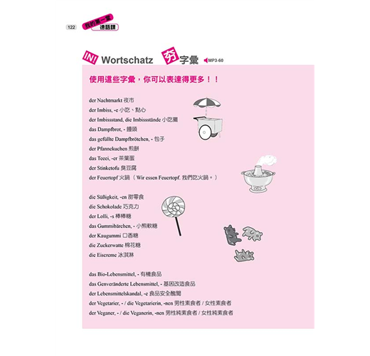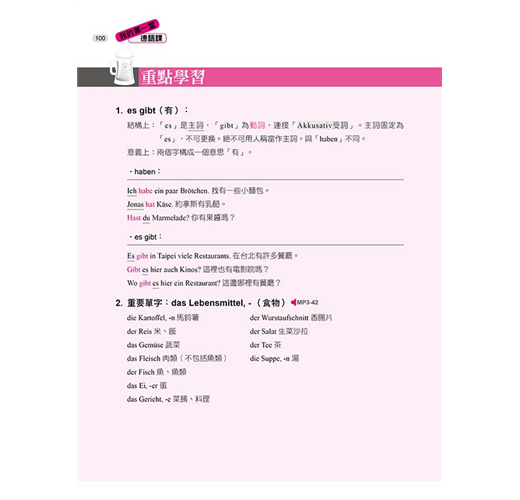 「學習重點」系統整理初級德語文法,並配合各課主題,學習最基礎、最實用的重要單字以及延伸單字,文法說明包含基本句型中一定會用到的名詞、動詞變化、疑問代名詞等,讓學習者能更清楚地了解句型或單字的使用原則。