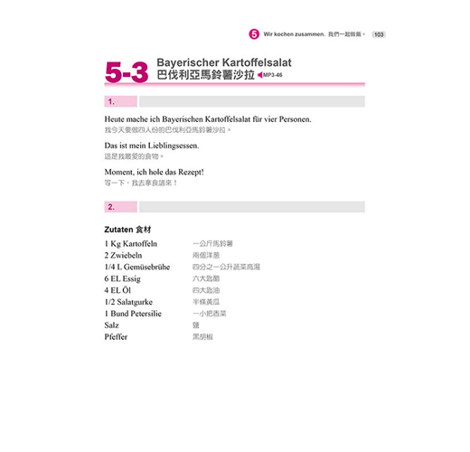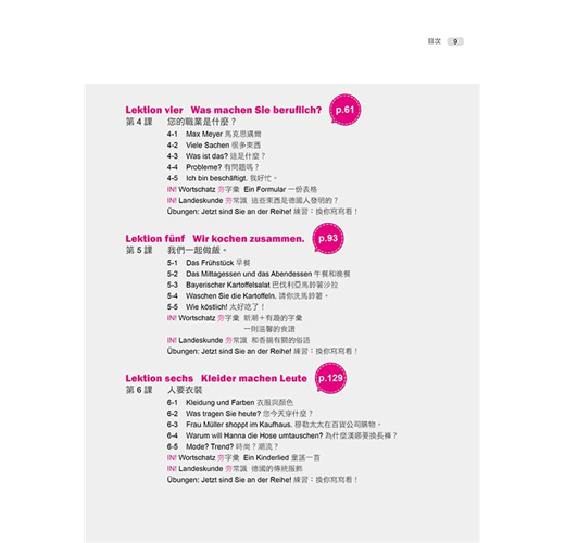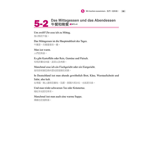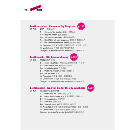 2. 本文:依照課程學習主軸,每課皆有模擬情境會話或實用句子,內容生動有趣,不像一般教科書一樣枯燥無趣,學習者會發現,原來使用德語交談一點也不難!