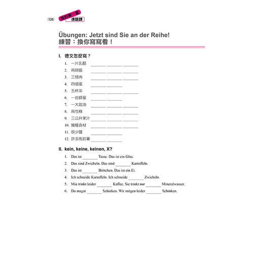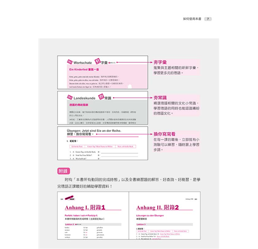 每一課都提供了德語全方位的練習題,在學習之後立即練習,讓學習者加深學習印象,奠定穩固的德語基礎。