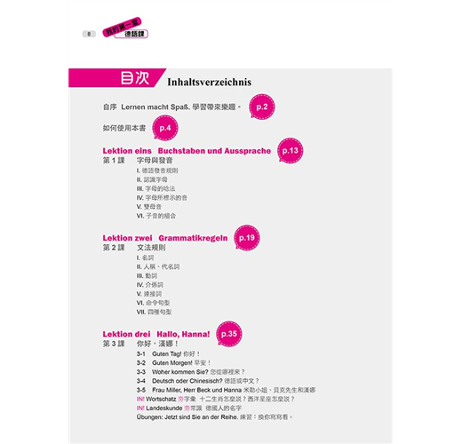 德語共有三十個字母,是以大家熟悉的二十六個英語字母,加上四個特殊的字母所組成。擁有豐富教學經驗的徐麗姍老師,用學習者最熟悉的注音符號輔助學習,並以表格整理出字母、字母的唸法、字母所標示的音,以及雙母音、雙子音、必須注意的字母組合,讓您學習德語發音更容易!本書從發音開始,循序漸進,待學習者完全熟悉發音和文字之後,再進入正課。