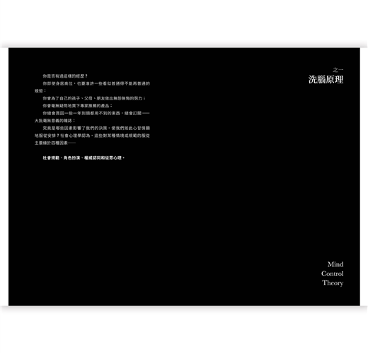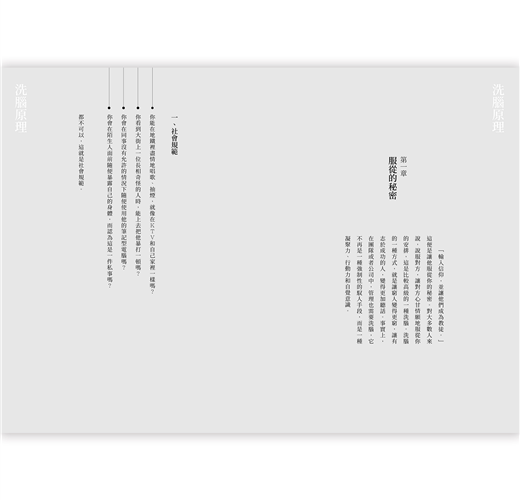 人腦可以像橡皮泥一樣被任意塑造嗎?什麼樣的環境和條件可以讓一個人變得不假思索就認同他人?人腦真的能夠被擦除然後植入新的思想嗎?你確定你以為你以為的就是你以為的嗎?到底哪一個才是真正的我?洗腦有哪些常用的手段?可以有效地防止被洗腦嗎?