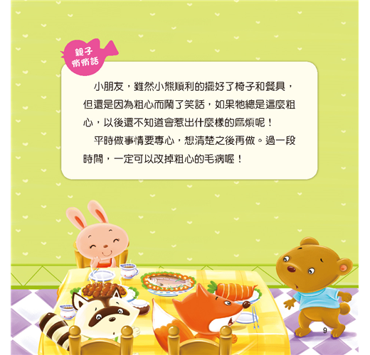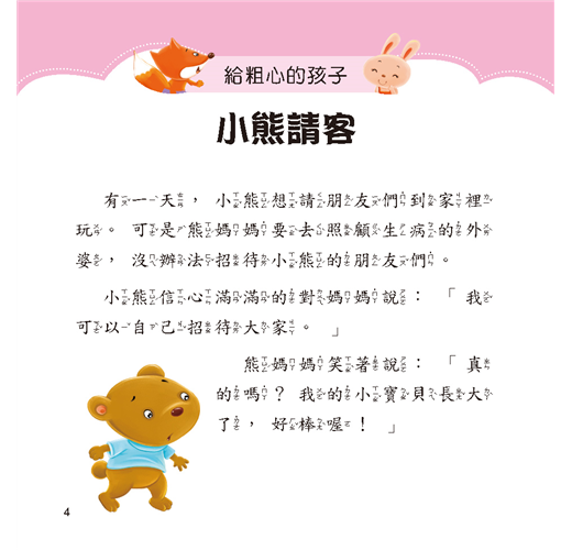 1. 針對孩子沒禮貌、不專心、不認錯……等行為,編寫八篇豐富有趣的故事,讓孩子邊聽故事邊學習。2. 故事內容淺顯易懂,貼近日常生活,幫助孩子理解寓意,並改正容易犯的小缺點。3. 角色造型可愛、色彩活潑多變,吸引孩子注意力,提升閱讀興趣。4. 書內附QR Code,只要拿手機或平板對著書中的QR Code掃描,就可以隨時「聽」故事。5. 故事發音清晰,敘述生動活潑,孩子可依語氣和對話,想像人物的情緒和故事情節,越聽越著迷。6. 適合親子共讀,和孩子一起說故事,共享溫馨的親子時光。
