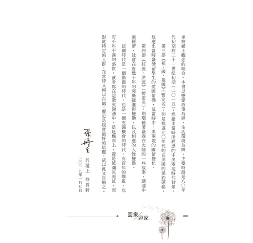 第二部《回「家」,「迴」家》是以「家」為核心,最重要的是講述文化的傳承與鄉土觀念的結合。本書以戀愛故事為經,生活環境為緯,主要時段是80年代初期到21世纪初期(2015) ,描繪出當時所經歷的中美兩地時代背景,。