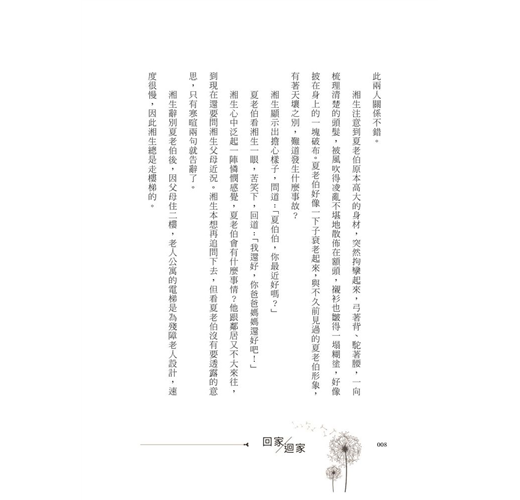 湘生辭別夏老伯後,因父母住二樓,老人公寓的電梯是為殘障老人設計,速度很慢,因此湘生總是走樓梯的。