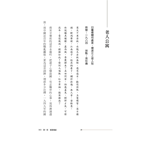 南宋辛棄疾的這首水龍吟,把遊子心懷故國、有志難申的心事,寫得淋漓盡致。而中國近百年的戰亂離愁,更為這首詞牌,增添多少注釋。1949年的國民政府遷台,隨政府赴台的二百多萬外省人,其中就包含許多最好的範例。