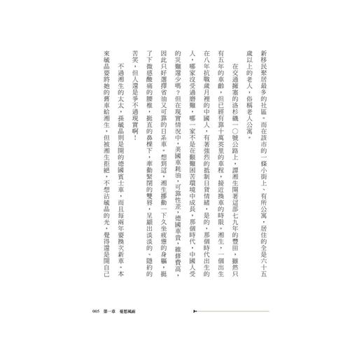 在交通擁塞的洛杉磯10號公路上,譚湘生開著這部79年的豐田,雖然只有五年的車齡,但已經有靠十萬英里的車程,接近換車的時限。湘生,—個出生在八年抗戰歲月裡的中國人,有著強烈的抵制日貨情緒,但在現實情況中,美國車耗油,可靠性差,德國車貴,維修費高,因此只好選擇省油又可靠的日系車。想到這,湘生挪動下久坐疲憊的身軀,挺下微感酸痛的腰椎,挺直的鼻樑下,牽動緊閉的雙唇,呈顯出淡淡的、隱約的苦笑,是的、那個時代出生的人,那—家沒受過磨難,那一家不是在艱難困苦環境中成長,因為營養關係,自己一米七的身高,雖比現在的年輕人顯得矮,但在同齡人中還算高個子,那個時代、中國人受的災難還少嗎?但人還是爭不過現實啊!