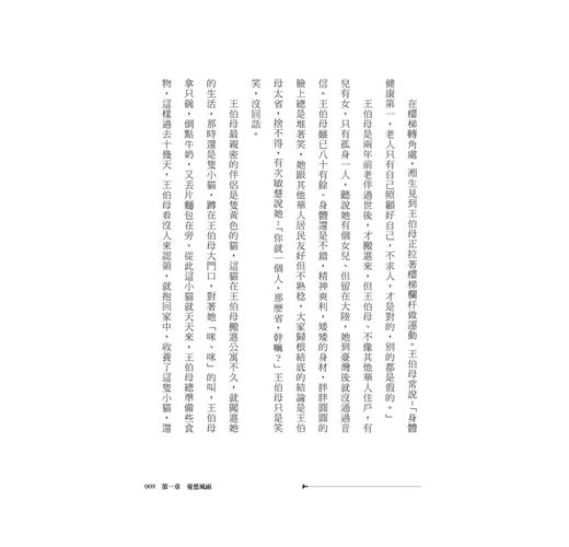 王伯母對着滿臉疑惑地湘生解釋道:「這是我所有積蓄,將來我過世後,除去辦後事的錢,所有餘錢,想請你幫忙,替我找到王倩,交給她。亅 說完這話,似乎意猶未盡,又補充道:「 當然我走後,也麻煩你替我照顧下咪咪,這世界上,她也只有我一個親人。亅